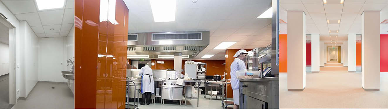The ability to control hygiene applies to ceilings as much as floors and walls. We can offer the prefect solution through a wide variety of ceiling coverings to suit all environments from suspended gridded ceilings with wipeable tiles in food preparation areas to vinyl ceilings in clean rooms